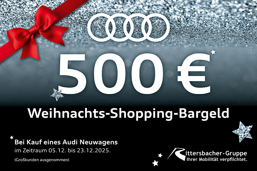 500 Euro Weihnachtsgeld bei Audi500 € Weihnachtsgeld-Aktion bei Audi! Jetzt wird’s festlich in Kaiserslautern und Grünstadt: Sichere dir 500 € Weihnachts-Shopping-Bargeld beim Kauf eines neuen Audi!* Gültig vom 05.12. bis 23.12.2025 Exklusiv in deinem Audi Zentrum Kaiserslautern und am Audi Standort Grünstadt Perfekt, um dir selbst oder deinen Liebsten noch einen Wunsch zu erfüllen Komm vorbei, entdecke dein neues Traumauto und starte mit einem Bonus ins Fest! *Ausgenommen Großkunden.