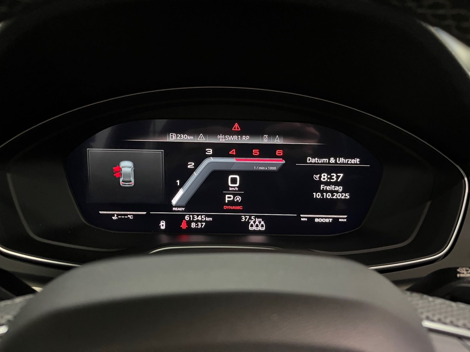 » Audi virtual cockpit plus» Bang & Olufsen Premium Soundsystem mit 3D Klang » Panorama-Glasdach Assistenzsysteme: » Assistenzpaket Stadt » Audi pre sense city» Audi pre sense rear» Kamerabasierte Verkehrszeichenerkennung» Reifendruck-Kontrollanzeige» Spurwechselwarnung Multimedia: » Audi Smartphone Interface» Audi connect Navigation & Infotainment» Digitaler Radioempfang» MMI Navigation plus mit MMI touch Technik & Sicherheit: » 3-Zonen-Komfortklimaautomatik» AdBlue-Tank mit erhöhtem Füllvolumen» Audi connect Notruf & Service mit Audi connect Remote & Control» Audi drive select» Außenspiegel elektrisch einstell-, beheiz- und anklappbar, beidseitig automatisch abblendend» Kindersitzbefestigung ISOFIX und Top Tether für die äußeren Fondsitze» Matrix LED-Scheinwerfer, OLED-Heckleuchten mit spezifischer Schlusslichtsignatur 1 und Scheinwerfer-Reinigungsanlage » Pedalerie und Fußstütze aus Edelstahl» S-Sportfahrwerk mit Dämpferregelung» Scheinwerfer-Reinigungsanlage» Seitenairbags vorn und Kopfairbagsystem» Start-Stop-System» Tagfahrlicht» tiptronic Interieur: » Einstiegsleisten mit Aluminiumeinlegern vorn, beleuchtet, S-Schriftzug» Frontscheibe in Klimakomfort- und Akustikverglasung drahtlos beheizbar» Innenspiegel automatisch abblendend, rahmenlos» Komfortmittelarmlehne vorn» Rücksitzbank plus» Sitzheizung vorn» Sportkontur-Lederlenkrad, 3-Speichen, unten abgeflacht mit Multifunktion plus» Vordersitze elektrisch einstellbar Exterieur: » Anhängevorrichtung » Bremssättel rot lackiert» Gepäckraumklappe elektrisch öffnend und schließend» Optikpaket schwarz plus» Privacy Verglasung (Scheiben abgedunkelt) Sonstiges: » Ambiente-Lichtpaket plus» Getränkehalter klimatisiert» Mikrofaser Dinamica Frequenz/Leder- Kombination mit S-Prägung» quattro mit selbstsperrendem Mittendifferenzial Audi Connect je nach Dienst zeitlich begrenzt, danach kostenpflichtig verlängerbar, Angaben zum Hersteller: AUDI AG, Audi, Auto-Union-Straße 1, 85057 Ingolstadt, Deutschland, +49-841-89-0, kundenbetreuung(at)audi.de, Produktinformationen: https://www.audi.de/de/rechtliches/gpsr/ Die angegebenen Verbrauchsangaben beziehen sich auf WLTP-Werte. Zwischenverkauf und Irrtümer für dieses Angebot sind ausdrücklich vorbehalten. Ausschlaggebend sind einzig und allein die Vereinbarungen in der Auftragsbestätigung oder im Kaufvertrag. Den genauen Ausstattungsumfang, die genauen Kilometer und den Verkaufspreis erhalten Sie von unserem Verkaufspersonal. Bitte kontaktieren Sie uns. Finanzierung