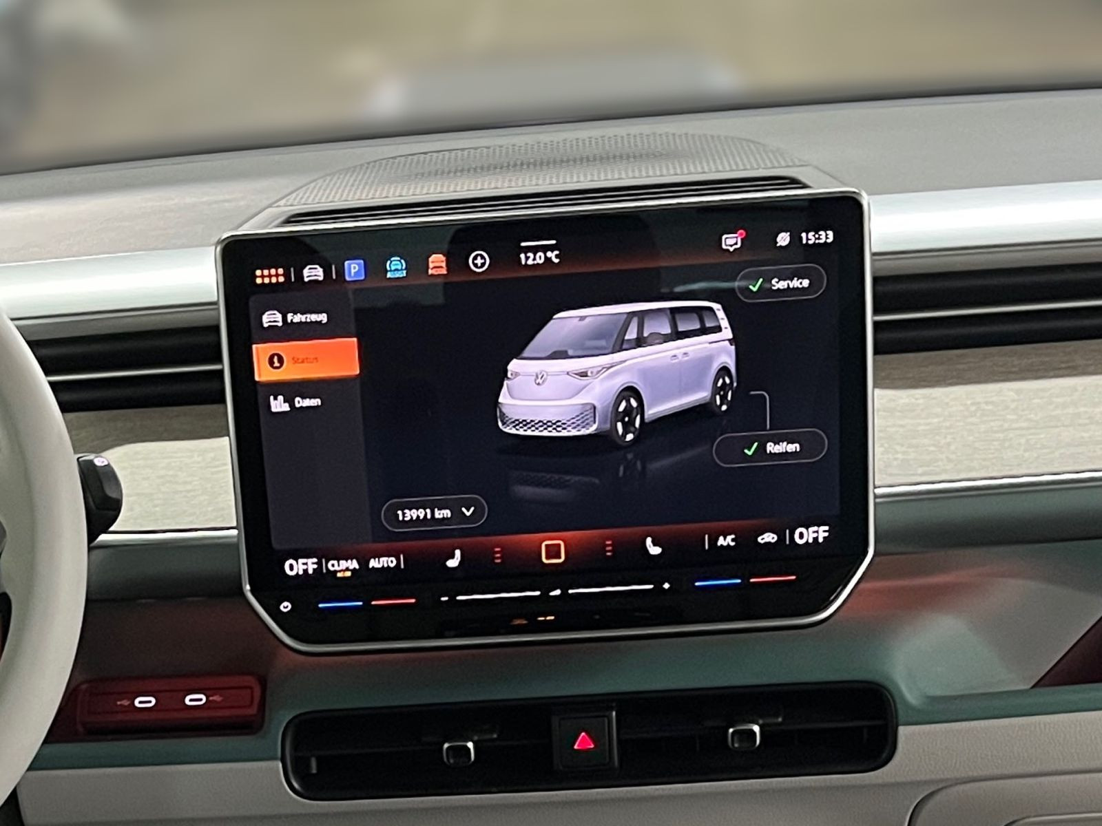 » Anhängevorrichtung anklappbar, mit elektrischer Entriegelung» Vordersitze mit Massagefunktion Assistenzsysteme: » Reifenkontrollanzeige» Intelligent Speed Assist inkl. Geschwindigkeitsbegrenzer» Geschwindigkeitsregelanlage in Verbindung mit Onlinediensten» Anti-Blockier-System (ABS)» Notbremsassistent Front Assist mit Fußgänger- und Radfahrererkennung» Verkehrszeichenerkennung» Ablenkungs- und Müdigkeitserkennung» Spurhalteassistent Lane Assist Multimedia: » Mobiltelefon-Schnittstelle Comfort mit induktiver Ladefunktion» Navigationssystem Discover Pro» Diversity-Antenne für FM-Empfang» Digitaler Radioempfang (DAB+)» Radio Ready 2 Discover mit 32,8 cm (12,9) Touch-Farbdisplay» 2 USB-C-Schnittstellen in der I-Tafel und 1 USB-C-Ladebuchse für Beifahrer, Ladeleistung bis zu 45 W» Mobiltelefon Schnittstelle Bluetooth» App-Connect inkl. App-Connect Wireless für Apple CarPlay und Android Auto Technik & Sicherheit: » Wärmepumpe Wärmepumpe» Bordwerkzeug, Wagenheber und Tire Mobility Set: 12-Volt-Kompressor und Reifendichtmittel» 3 Zonen Klimaanlage Air Care Climatronic mit Standklimatisierung und 2. Klimaanlage im Fahrgastraum» LED-Scheinwerfer» LED-Rückleuchten» Notrufsystem eCall, Voraussetzung: Verfügbarkeit benötigter Mobilfunknetze» Einparkhilfe - Warnsignale bei Hindernissen im Front- und Heckbereich» Airbags für Fahrer und Beifahrer, mit Beifahrerairbag-Deaktivierung» Seiten- und Kopfairbags für Fahrer und Beifahrer sowie Mittenairbag vorn» Zentralverriegelung mit schlüssellosem Startsystem Keyless Start, ohne Safesicherung» Wegfahrsperre elektronisch» e-Sound» Servolenkung elektromechanisch, geschwindigkeitsabhängig geregelt» CCS-Ladedose» Getriebe für Elektroantrieb ( 1-Gang ) Interieur: » Sitzheizung für Vordersitze sowie die äußeren Sitze der 2. Sitzreihe im Fahrgastraum, getrennt regelbar» Sitze im Fahrerhaus: Fahrer- und Beifahrersitz heizbar» Lendenwirbelstütze vorn pneumatisch einstellbar, mit Massagefunktion» Multifunktionslenkrad in Leder, mit Touch-Bedienung, beheizbar» Rücksitzbank-/lehne, geteilt, umlegbar Exterieur: » Candy-Weiß» Farbe Candy-Weiß» Schiebetür links» Schiebetür rechts» Kurzer Radstand Sonstiges: » Infotainment-Paket» Sprachassistent IDA» Netzladekabel für Haushalts-Steckdose (Mode 2 Typ 2, 10A)» Interieur Style Plus mit Lenkrad in Electric White» Einfassung der zentralen Bedienungselemente in Electric White» Sitzeinstellung, elektrisch, für beide Vordersitze mit Memory und Fahrerseite mit Smart Comfort Einstiegshilfe» Armlehnen für Vordersitze beidseitig» Ambientebeleuchtung 30-farbig» Rechtsverkehr Linkslenker» Außenspiegel elektrisch einstell- und beheizbar» Außenspiegelgehäuse in Schwarz und Türgriffe in Wagenfarbe» Leuchtweitenregulierung, manuell (statisch)» Wärmeschutzglas (grün)» 9 Lautsprecher (5 Lautsprecher vorn und 4 Lautsprecher hinten)» Vorbereitet für We Connect (Plus) oder VW Connect (Plus), Online-Update- Fähigkeit (außer für Sonderumbauten)» Innenraumfilter: Aktiv Kombifilter» ISOFIX und Top Tether auf den äußeren Rücksitzen und Beifahrersitz, I-Size für Beifahrersitz und äußere Sitze 2. SR» 5 Sitze» Sitze im Fahrerhaus: Beifahrereinzelsitz» Proaktives Insassenschutzsystem in Verbindung mit dem Front Assist» Innenbeleuchtung im Fußraum vorn und hinten» LED-Gepäckraumbeleuchtung» Sonnenblenden mit Spiegel, beleuchtet, mit Airbag-Label auf Sonnenblende und B-Säule» Betriebsspannung 12 Volt mit 12 Volt Steckdose im Laderaum» Multifunktionskamera» Bremsbelagverschleissanzeige» Ausweichunterstützung und Abbiegeassistent» Radvollblenden in BiColor (Schwarz/Silber)» HV-Batterie 79 kWh netto» Ladekabel Mode 3 Typ 2, 16A» Karosserie/Aufbau: Bus» Radstand 2989 mm» Heckantrieb» Elektromotor 210 kW (cont. 89 kW) Garantie 24 Monate ab Tag der Erstzulassung, Angaben zum Hersteller: Volkswagen AG, Volkswagen Nutzfahrzeuge, Mecklenheidestraße 74, 30419 Hannover, Deutschland, +49-5361-9-0, kundenbetreuung(at)volkswagen.de, Produktinformationen: https://www.volkswagen.de/idhub/content/dam/onehub_master/downloads/product-safety-cv/volkswagen-cv-sicherheitshinweise-de.pdf Die angegebenen Verbrauchsangaben beziehen sich auf WLTP-Werte. Zwischenverkauf und Irrtümer für dieses Angebot sind ausdrücklich vorbehalten. Ausschlaggebend sind einzig und allein die Vereinbarungen in der Auftragsbestätigung oder im Kaufvertrag. Den genauen Ausstattungsumfang, die genauen Kilometer und den Verkaufspreis erhalten Sie von unserem Verkaufspersonal. Bitte kontaktieren Sie uns. Finanzierung