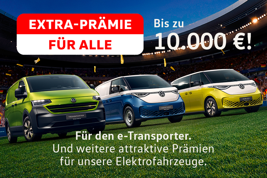 Bis zu 10.000,- € Prämie für ElektrofahrzeugeJetzt schon jubeln! Die Extra-Prämie: Bis zu 10.000 € für den e-Transporter und weitere Prämien für den ID. Buzz und den ID.Buzz Cargo.