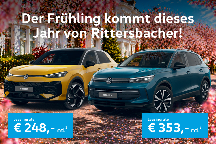 Der Frühling kommt dieses Jahr von Rittersbacher!Starten Sie durch mit Ihrem neuen Tiguan oder dem T-Roc. Sichern Sie sich jetzt unsere exklusiven Aktionsvorteile für zwei der beliebtesten Volkswagen Modelle. Der Tiguan überzeugt als souveräner Allrounder mit Oberklasse-Komfort, innovativem Infotainment und einem großzügigen Raumangebot, das keine Kompromisse im Familienalltag zulässt. Wer es hingegen kompakter und ausdrucksstärker liebt, findet im T-Roc den perfekten Begleiter für die Stadt. Ein SUV mit echtem Charakter, das Agilität und modernes Design stilsicher vereint. Ob Sie Ihren neuen VW bestellen oder Sie sich für einen unserer sofort verfügbaren Lagerwagen entscheiden: Sie profitieren in jedem Fall von unseren aktuellen Aktionsvorteilen. Unsere Verkaufsteams in Kaiserslautern, Grünstadt und Germersheim warten auf Ihren Anruf oder Ihren Besuch. Tiguan ENERGY 2,0 l TDI SCR 110 kW (150 PS), 7-Gang-Doppelkupplungsgetriebe DSG Sonderzahlung: 2.425 Euro Jährliche Fahrleistung: 10.000 km Laufzeit: 48 Monate mtl. Leasingrate: 353 Euro1 Energieverbrauch kombiniert: 5,5 l/km; CO2-Emissionen kombiniert: 144 g/km ; CO2-Klasse: E