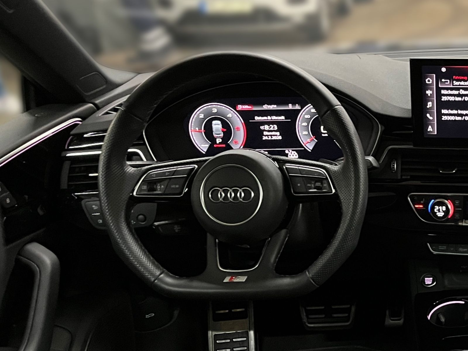 » Audi virtual cockpit plus » Bang & Olufsen Premium Soundsystem mit 3D Klang » Panorama-Glasdach Assistenzsysteme: » Audi pre sense city » Reifendruck-Kontrollanzeige Multimedia: » Audi connect Navigation & Infotainment » Digitaler Radioempfang » MMI Navigation plus mit MMI touch » Smartphone-Interface » USB-Ladeschnittstellen im Fond Technik & Sicherheit: » 3-Zonen-Komfortklimaautomatik » AdBlue-Tank mit erhöhtem Füllvolumen » Airbags vorn, Beifahrerairbag deaktivierbar » Audi connect Notruf & Service mit Audi connect Remote & Control » Audi drive select » Außenspiegel elektrisch einstell-, beheiz- und anklappbar, beidseitig automatisch abblendend » Einparkhilfe plus » Kindersitzbefestigung ISOFIX und Top Tether für die Fondsitze » Komfortschlüssel mit sensorgesteuerter Gepäckraumentriegelung » Komfortschlüssel ohne Safelock » LED-Heckleuchten mit dynamischer Lichtinszenierung und dynamischem Blinklicht » Matrix LED-Scheinwerfer mit Audi Laserlicht, dynam. Lichtinszenierung unddynamischem Blinklicht » Matrix LED-Scheinwerfer mit dynamischem Blinklicht » Pedalerie und Fußstütze aus Edelstahl » S tronic » Scheinwerfer-Reinigungsanlage » Seitenairbags vorn und Kopfairbagsystem » Start-Stop-System » Tagfahrlicht » Tiptronic Interieur: » Audi phone box light » Einstiegsleisten mit Aluminiumeinlegern vorn, beleuchtet, S-Schriftzug » Innenspiegel automatisch abblendend, rahmenlos » Interieur S line » Komfortmittelarmlehne vorn » Mikrofaser Dinamica Frequenz/ Leder-Kombination mit S-Prägung » Sitzheizung vorn » Sportkontur-Lederlenkrad, 3-Speichen, unten abgeflacht mit Multifunktion plus » Vordersitze elektrisch einstellbar Exterieur: » Außenspiegelgehäuse in Schwarz » Gepäckraumklappe elektrisch öffnend und schließend » Optikpaket schwarz » Räder Audi Sport, 5-Doppelspeichen-Polygon, schwarz, glanzgedreht, 9,0Jx20, Reifen 265/30 R20 » Sonnenschutzverglasung abgedunkelt Sonstiges: » Ambiente-Lichtpaket plus » Stoßfänger S line » Variable Kopfstützen für die Vordersitze Audi Connect je nach Dienst zeitlich begrenzt, danach kostenpflichtig verlängerbar, Angaben zum Hersteller: AUDI AG, Audi, Auto-Union-Straße 1, 85057 Ingolstadt, Deutschland, +49-841-89-0, kundenbetreuung(at)audi.de, Produktinformationen: https://www.audi.de/de/rechtliches/gpsr/ Die angegebenen Verbrauchsangaben beziehen sich auf WLTP-Werte. Zwischenverkauf und Irrtümer für dieses Angebot sind ausdrücklich vorbehalten. Ausschlaggebend sind einzig und allein die Vereinbarungen in der Auftragsbestätigung oder im Kaufvertrag. Den genauen Ausstattungsumfang, die genauen Kilometer und den Verkaufspreis erhalten Sie von unserem Verkaufspersonal. Bitte kontaktieren Sie uns. Finanzierung
