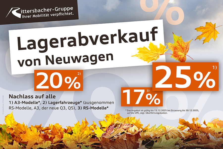 Audi Lagerabverkauf Neuwagen - Jetzt zuschlagen.Du suchst dein Traumauto? Ob kompakt, sportlich oder luxuriös – bei uns wartet Ihr neuer Audi schon auf sie. 25 % Nachlass auf alle A3 Modelle 20% Nachlass auf alle Lagerfahrzeuge (ausgenommen RS-Modelle, A3, der neue Q3, Q5) 17% Nachlass auf alle RS-Modelle Riesige Auswahl: Kompakt, Limousine, SUV & Performance Starke Finanzierungs- und Leasingkonditionen. Exklusiv sofort verfügbar – keine langen Wartezeiten. Neueste Technik & Assistenzsysteme direkt ab Werk. Spare jetzt mit attraktiven Sonderkonditionen Probefahrt? Einfach hier buchen oder anrufen. Kaiserslautern: 0631-6245961 800 Grünstadt: 06359-9690 65 Das Angebot ist gültig bis 15.12.2025 bei Zulassung bis 30.12.2025. Nur solange der Vorrat reicht, im Audi Zentrum Kaiserslautern und an unserem Standort in Grünstadt!