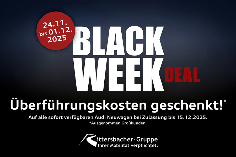 Black Week - Überführungskosten geschenktVom 24.11. bis 01.12.2025 schenken wir Ihnen die Überführungskosten. Profitieren Sie von unserem starken Black-Week-Deal auf sofort verfügbare Audi Neuwagen bei Zulassung bis zum 15.12.2025. Der Black-Week-Deal ist kombinierbar mit unserer aktuellen Lagerabverkaufsaktion. Jetzt ist der perfekte Zeitpunkt, sich Ihren neuen Audi zu sichern! Wir freuen uns auf Ihren Besuch.