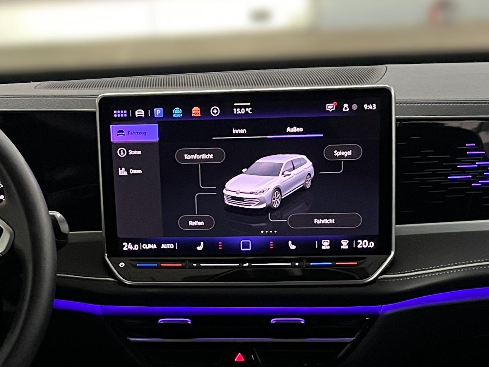 » Anhängevorrichtung anklappbar, mit elektrischer Entriegelung» Digital Cockpit Pro, mehrfarbig, verschiedene Info-Profile wählbar» Vordersitze mit Massageprogrammen Assistenzsysteme: » Abbiege- und Schlechtwetterlicht» Ablenkungs- und Müdigkeitserkennung» Automatische Distanzregelung ACC stop & go» Berganfahrassistent» Dynamischer Fernlichtassistent Dynamic Light Assist» Fahrassistent Travel Assist, Spurhalteassistent Lane Assist und Emergency Assist» Fahrlichtschaltung automatisch, mit LED-Tagfahrlicht sowie Begrüßungs- und Verabschiedungslicht» Geschwindigkeitsbegrenzer mit vorausschauender Regelung» IQ.LIGHT - LED-Matrix-Scheinwerfer mit Fernlicht Plus, Kurvenfahrlicht und dynamischer Blinkleuchte» Memory-Funktion für Parkassistent» Notbremsassistent Front Assist mit Fußgänger- und Radfahrererkennung» Regensensor» Reifenkontrollanzeige» Spurwechselassistent Side Assist, Ausparkassistent und Ausstiegswarnung» Verkehrszeichenerkennung Multimedia: » 2 USB-C-Schnittstellen vorn, 2 USB-C-Ladebuchsen an der Mittelkonsolehinten» App-Connect Wireless für Apple CarPlay und Android Auto» Digitaler Radioempfang DAB+» Navigationssystem» Sprachassistent IDA und elektronische Sprachverstärkung Technik & Sicherheit: » ISOFIX-Halteösen für Kindersitze auf denäußeren Rücksitzen sowie auf dem Beifahrersitz, i-Size-kompatibel» Klimaanlage Air Care Climatronic mit Aktiv-Kombifilter, Bedienelementen hinten und 3-Zonen-Temperaturregelung» Kopfairbags vorn und hinten, Seitenairbags vorn, Center-Airbag» LED-Rückleuchten mit dynamischer Blinkleuchte, mit Chromleiste» Notruf-Service, Laufzeit 10 Jahre ab Erstauslieferung, Voraussetzung: Verfügbarkeit benötigter Mobilfunknetze» Parkassistent Park Assist Pro, inkl. Einparkhilfe» Schlüsselloses Schließ- und Startsystem Keyless Access, mit berührungsloser Ver- und Entriegelung, SAFE-Verriegelung» Sportfahrwerk, Karosserie tiefergelegt» Start-Stopp-System mit Bremsenergie-Rückgewinnung» Umgebungsansicht Area View inkl. Rückfahrkamera Rear View Interieur: » Innenspiegel automatisch abblendend» Lendenwirbelstützen vorn pneumatisch einstellbar» Mittelarmlehne hinten verschiebbar, mit Becherhaltern und Ablagemöglichkeit für Handy/Tablet» Multifunktionslenkrad in Leder, beheizbar, mit Schaltwippen» Rücksitzlehne asymmetrisch geteilt umklappbar, mit Durchlademöglichkeit» Sitzmittelbahnen der Vordersitze und deräußeren Rücksitzplätze in Mikrovlies ArtVelours Eco» Sport-Komfortsitze vorn» Vordersitze beheizbar, Sitzfläche und -lehne getrennt einstellbar» ergoActive-Sitze vorn höheneinstellbar, mit verschiebbarer Oberschenkelauflage Exterieur: » Easy Open & Close - Heckklappe mit sensorgesteuerter Öffnung und Schließung, mit Fernentriegelung» Außenspiegel elektrisch anklapp- und beheizbar, auf Fahrerseite abblendend, Beifahrerspiegelabsenkung» Dachreling silber eloxiert» Sportpaket Sonstiges: » Ladeleistung bis zu 45 W» Akustikpaket» Ambientebeleuchtung» inkl. Anhängerrangierassistent Trailer Assist» Anhängevorrichtung inkl. Anhängerrangierassistent Trailer Assist» Assistenzpaket IQ.DRIVE» Fahrprofilauswahl» Infotainment-System mit 32,7-cm-Display (12,9 Zoll)» Multifunktionskamera» Stofänger in Wagenfarbe, Lufteinlass mitChromleisten» Verbundsicherheitsglas, geräuschdämmend für Seitenscheiben» Heck- und Seitenscheiben hinten abgedunkelt Garantie 24 Monate ab Tag der Erstzulassung, Angaben zum Hersteller: Volkswagen AG, Volkswagen, Berliner Ring 2, 38440 Wolfsburg, Deutschland, +49-5361-9-0, kundenbetreuung(at)volkswagen.de, Produktinformationen: https://www.volkswagen.de/idhub/content/dam/onehub_master/downloads/product-safety/volkswagen-sicherheitshinweise-de.pdf Die angegebenen Verbrauchsangaben beziehen sich auf WLTP-Werte. Zwischenverkauf und Irrtümer für dieses Angebot sind ausdrücklich vorbehalten. Ausschlaggebend sind einzig und allein die Vereinbarungen in der Auftragsbestätigung oder im Kaufvertrag. Den genauen Ausstattungsumfang, die genauen Kilometer und den Verkaufspreis erhalten Sie von unserem Verkaufspersonal. Bitte kontaktieren Sie uns. Finanzierung